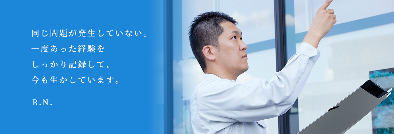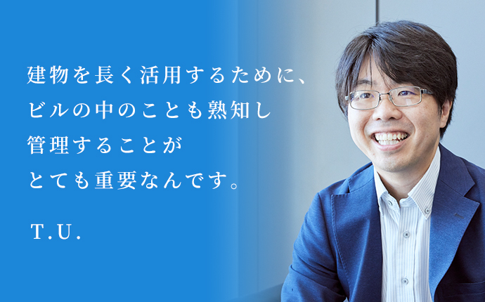 - 入社して2〜3年目の頃、ある商業施設で排水管に関するトラブルが発生し、1ヶ月以上全て夜間対応となる大規模な調査が必要になりました。業者の方やテナントさん、関係者の方々に地道にヒアリングを行い、実地調査をしました。様々なテナントさんが入居しているので、原因もそれぞれ異なり、一つずつ解決していくことで、結果的に全体の解決につなげることができました。それ以来、同様の問題は発生しておらず、その時の記録をしっかりとって生かせていることに達成感や充実感を感じます。
