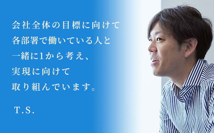 各部署の機能を俯瞰的な視点で把握し、会社の目標に向けた動きを協議、協業しながら仕事に取り組んでいます。なかには、数字には表れにくい見えない課題、プロセス上での課題もあるので、実務をしている方とコミュニケーションを取り、解決するようにしています。